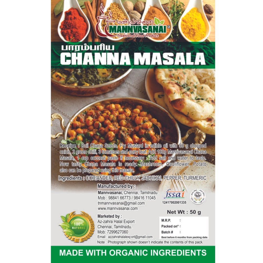 To prepare a mouthwatering Channa Masala, cook your soaked chickpeas until tender, then sauté onions, tomatoes, and ginger-garlic paste in oil. Add 2-3 teaspoons of Mannvasanai’s Channa Masala and stir until the spices release their aroma. Mix in the cooked chickpeas, add water to your desired consistency, and let it simmer until the flavors meld. Garnish with fresh coriander leaves and serve with rice, roti, or naan for a complete meal. This masala can also be used to flavor other legumes or vegetable curries. - Storage Tips: