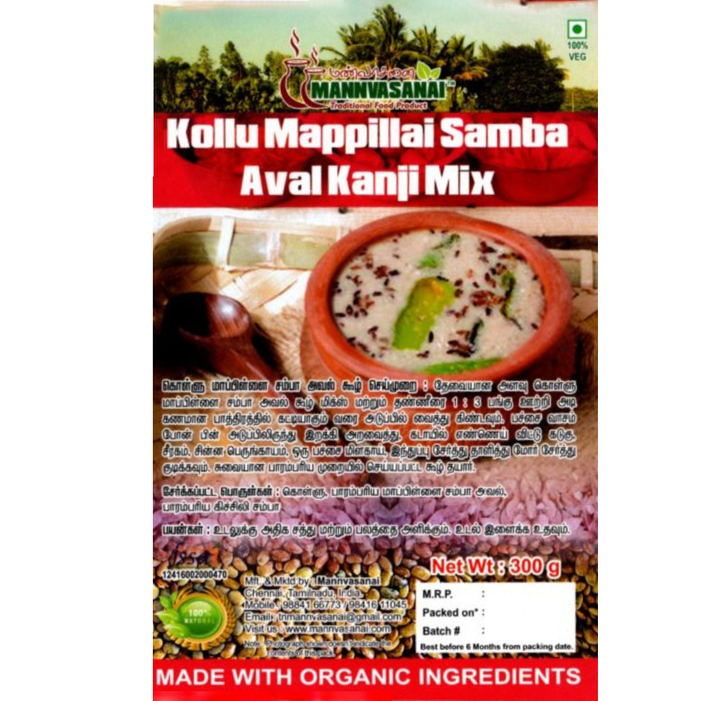 Store Kollu Mappilai Samba Aval Kanji Mix in an airtight container in a cool, dry place to maintain its freshness and quality. Keep it away from moisture and direct sunlight to preserve its flavor and effectiveness. - About Mannvasanai: