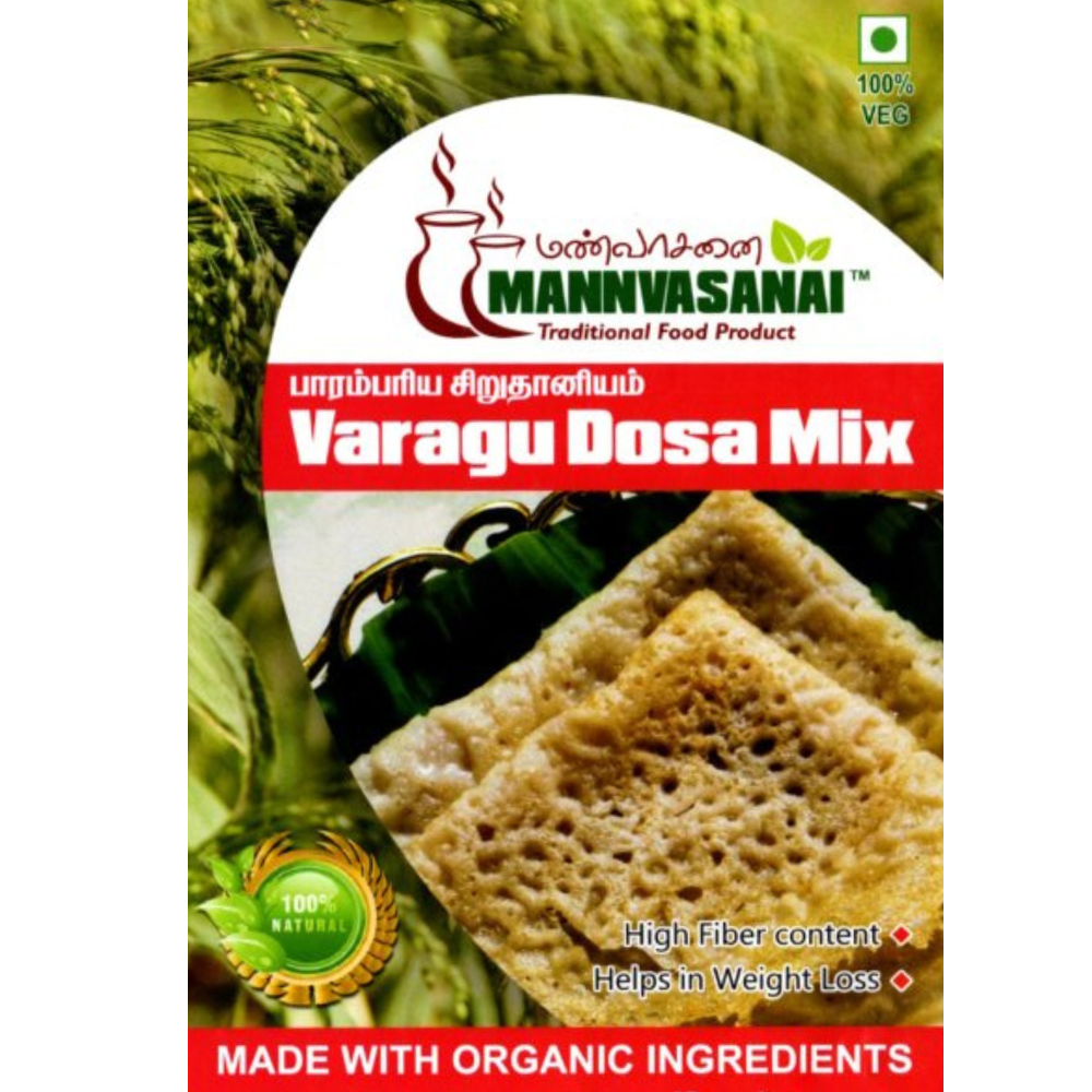 To prepare Varagu dosas, combine 1 cup of Mannvasanai’s Varagu Dosa Mix with 1.5 cups of water or buttermilk to form a smooth batter. Let the batter rest for 15-20 minutes for optimal consistency. Heat a non-stick skillet or dosa pan, lightly grease it, and pour a ladleful of batter onto the pan, spreading it into a thin circle. Cook on medium heat until the dosa is golden brown and crispy. Serve hot with your favorite chutney or sambar for a nourishing meal. - Storage Tips: